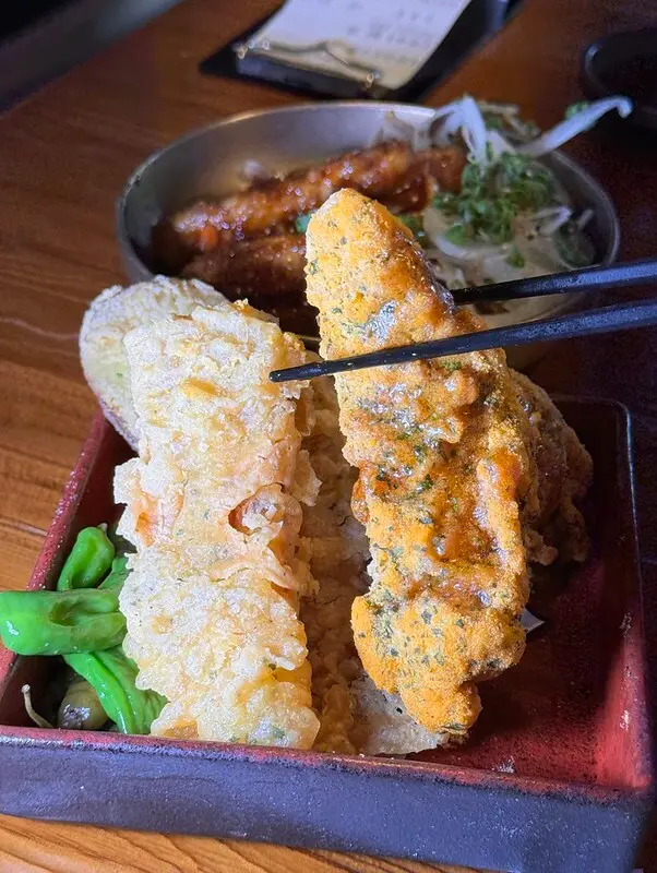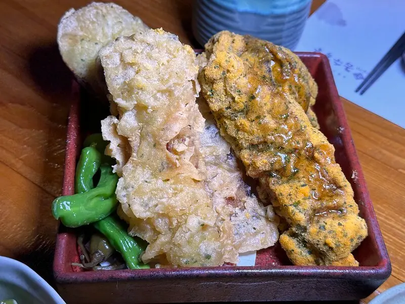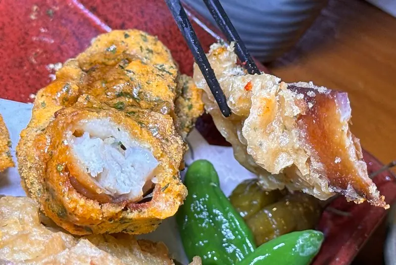 第三吃也是炸河,但用了不同的麵包,炸法有一點像厚天婦羅,麵衣的存在感比較強,右邊加了海苔的黃色麵衣好好吃,比較特別的是裡面還有一層地瓜,地瓜加河豚這是有趣又美味的創意。前後兩道都是炸過的河豚,吃將上來還真是有明顯的不同。