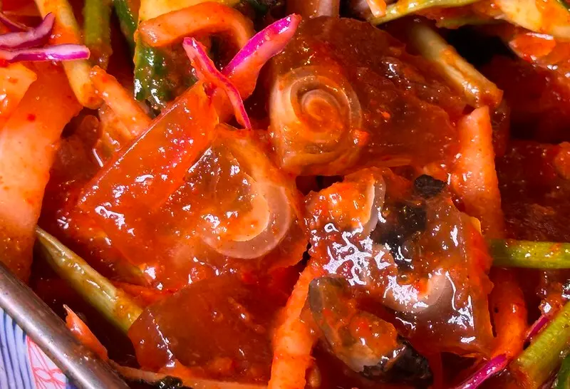 河豚皮凍吃起來非常脆Q,雖然仍感到微微的腥,但因為韓式辣醬的調配其實不算明顯,最少比我預期的好吃。