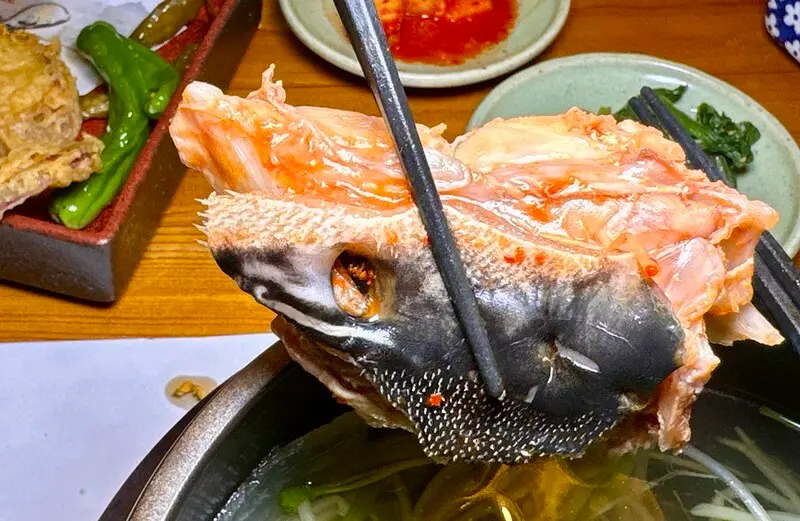 第四吃的河豚湯據說是店裡的招牌,有清湯和辣湯兩種,清湯喝來清爽,但不得不說有偏偏的海味(不喜歡的可能會覺得是微腥),裡面撈到的是帶剌的河豚皮、河豚頭,視覺的衝擊還是有的......。