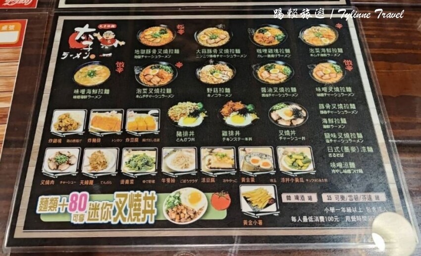 餐點主要都是拉麵,還有幾款飯類可以選,如果食量大一點的人除了可以免費加湯加麵外,拉麵還可以加購「迷你叉燒丼」,一次把兩種招牌日式餐點都吃一遍