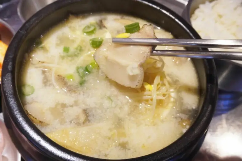 豬肉湯飯的湯頭是用豬骨熬煮,醇白濃郁,喝起來滋味甘甜。
