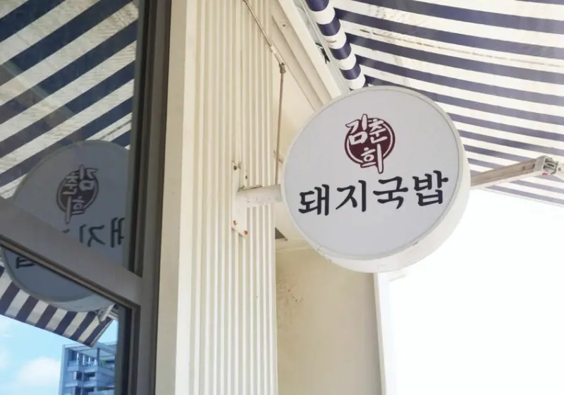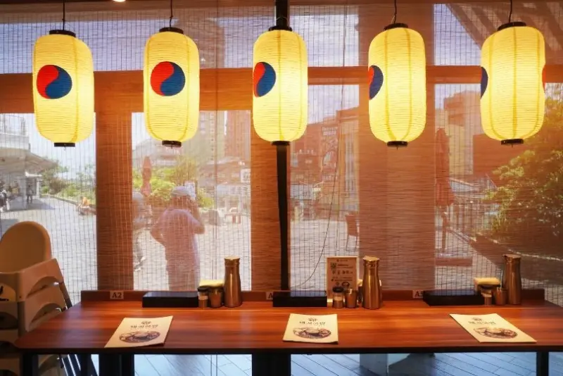 金春喜韓廚-基隆好食城店的店面位於開飯川食堂右側,在轉角處可以看到一個圓形招牌。從大門走進去,中間是服務櫃台。