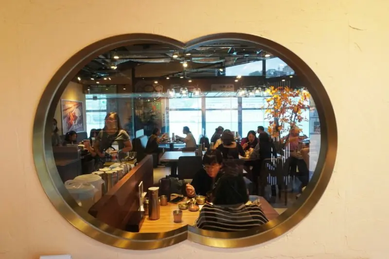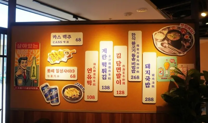 左側有一面美拍打卡牆,上面除了有韓文標示,料理美照還有各種繪圖裝飾。右側還有一面造型玻璃窗,可以瞧見靠港一側的用餐狀況,環境超美,可以近距離欣賞郵輪。