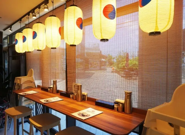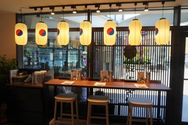 大門兩側的落地窗,正是單人高腳椅座位區,特別掛上繪有太極標誌的白色燈籠。