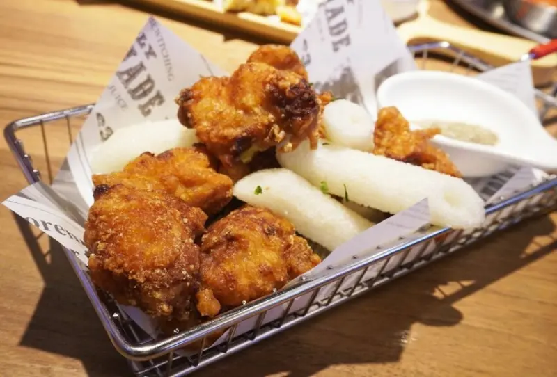 除了炸雞,還有白色條狀的韓國甜不辣,吃起來口感Q彈有嚼勁。