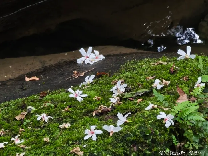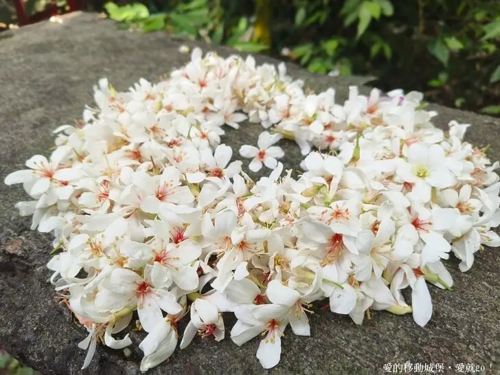 桐花就像雪花般飛落,步道及兩旁草坪佈滿飄落的白色油桐花,好似白雪覆蓋一般,這就是油桐花浪漫、迷人的地方!