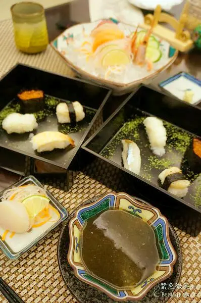 這裡的日本料理算是很講究的。他們選用日本有名的九谷燒跟輪島漆來當餐具喔。餐具很精緻、很美觀,真的感官上的一大享受。![]()