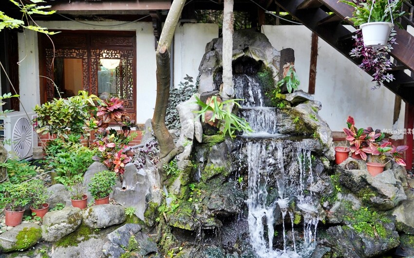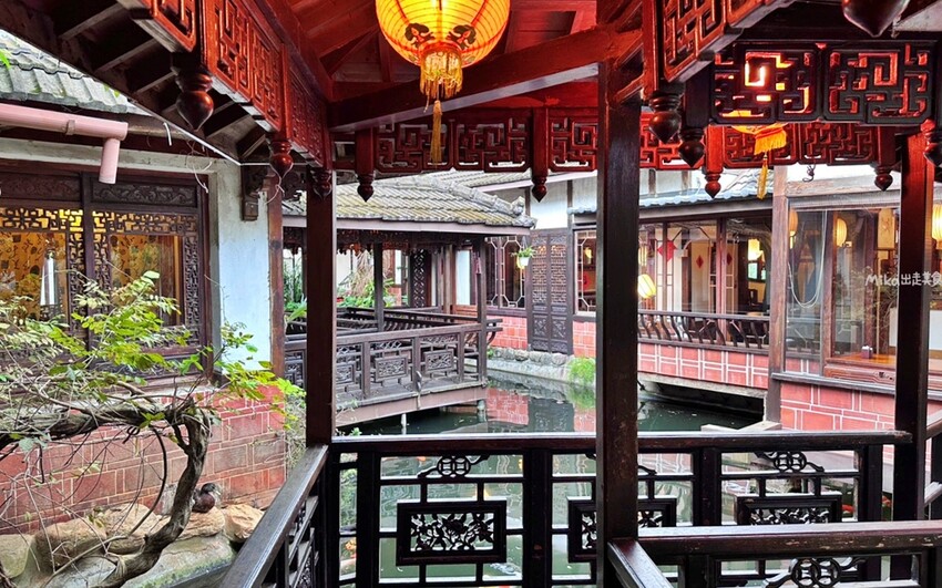 晚上來的話,古色古香的氛圍感覺會更濃郁。聽到潺潺流水聲,原來是這裡藏了一個小瀑布呢。走進室內空間,彷彿穿越時空一樣。整個就是江南水鄉風格的古色古香建築,掛著燈籠更是增添了不少氣氛。