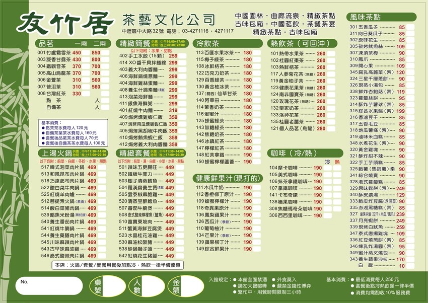 這裡的菜單很豐富,有品茗、簡餐、火鍋、茶點等等可以選。價格跟一般的簡餐店差不多。不過它的環境價值是滿分,光環境就值回票價啦。消費方式是每個人低消250元,然後需要再加收10%服務費。好處就是它真的不限時,跟朋友來這裡聊天聊多久都沒壓力。有時候茶點跟飲料隨便點一點,其實也很容易就破千元了,哈哈。