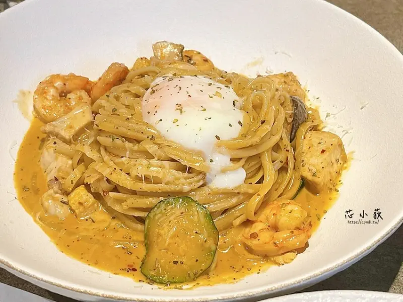 義大利麵可以選擇免費加麵,裡面有手剝白蝦、水波蛋、雞肉、季節鮮蔬,選擇辣醬口味挺過癮的。
