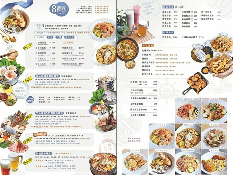 8德司 創意餐館提供義式套餐,套餐包含雞湯暢飲+冰淇淋自助吧+綠茶/紅茶 擇1+現烤黃金奶油麵包+招牌脆薯,義式主餐主要有九種口味,其中可以選擇燉飯/Q麵/義大利麵,醬料可以選擇麻奶醬/橘醬/白醬/辣醬/清炒,另外還有海鮮塔蒸煮火鍋、披薩、炸物等。