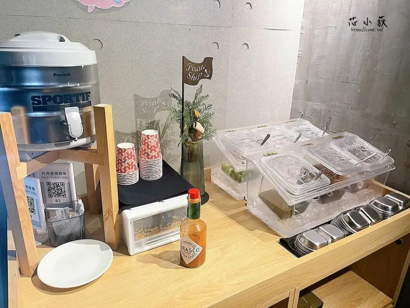 醬料蔥花區在這裡,吃海鮮塔蒸煮火鍋可以搭配醬料,也有提供開水。