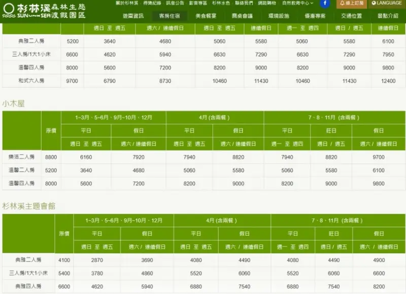 杉林溪森林生態渡假園區住宿資訊與價目表