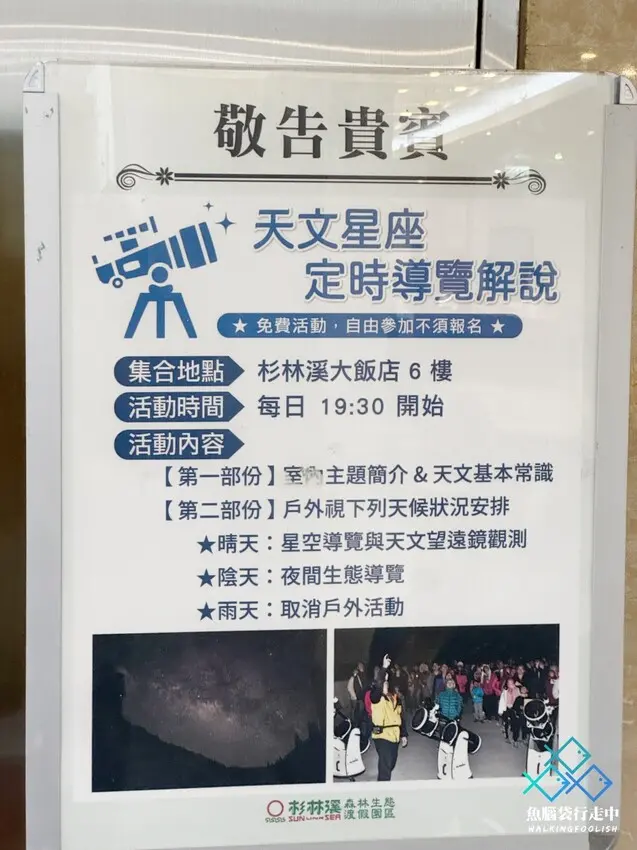 我們這回入住的是杉林溪大飯店的方案是假日溫馨四人房(含2餐),入住費用約新台幣6,000~8,000元左右。印象最深刻的是我們剛好遇到了「夜晚觀星導覽活動」,讓我們入住杉林溪大飯店同時有個學習新知的大自然體驗。