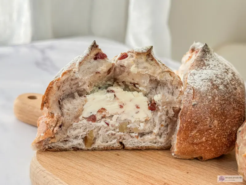 葡萄乾跟蔓越莓,個人比較偏愛蔓越莓的酸甜,中間滿滿的Cream Cheese,還吃得到堅果的口感,麵包體柔軟帶有彈性,還有麵粉的香氣相當好吃