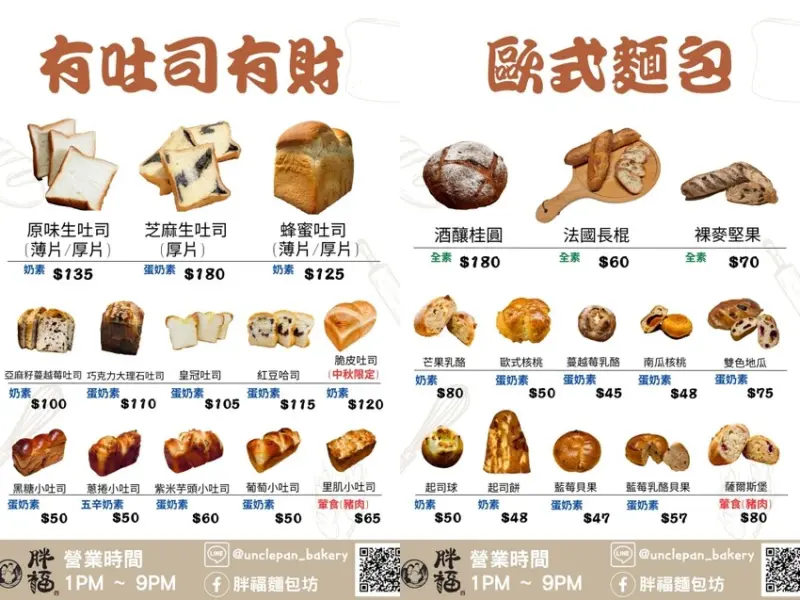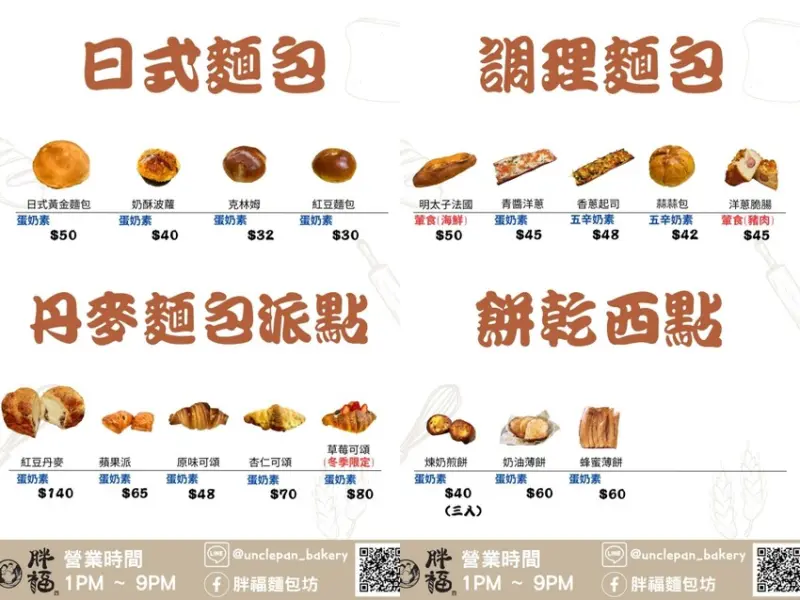 還有各種口味的小吐司、歐式麵包、日式麵包、調理麵包、丹麥麵包派點、餅乾西點等多達50種,價格落在$30~$180之間,有些產品是季節限定唷!!