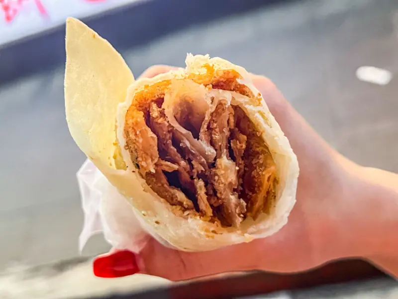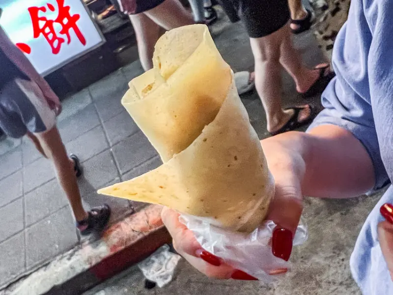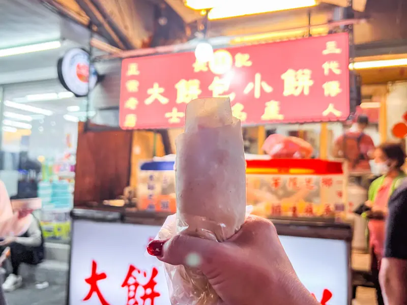 我那天就買了一捲甜花生口味的,畢竟花生口味感覺就是最經典、最一開始的招牌味道嘛。這個大餅包小餅呢,簡單來說就是用潤餅皮,包著那個敲碎的炸酥餅。那個酥餅啊,單吃基本上是沒有什麼味道的,但是,但是,當你加了甜甜香香的花生粉之後,那個美味度啊,真的是可以用「爆炸性成長」來形容!咬下去的口感是Q中帶酥脆,因為有潤餅皮的Q勁,又有炸酥餅的脆。而且他們家的花生粉甜度剛剛好,不會太死甜,又非常香濃。一個人喀完一整捲,也不會覺得膩喔。