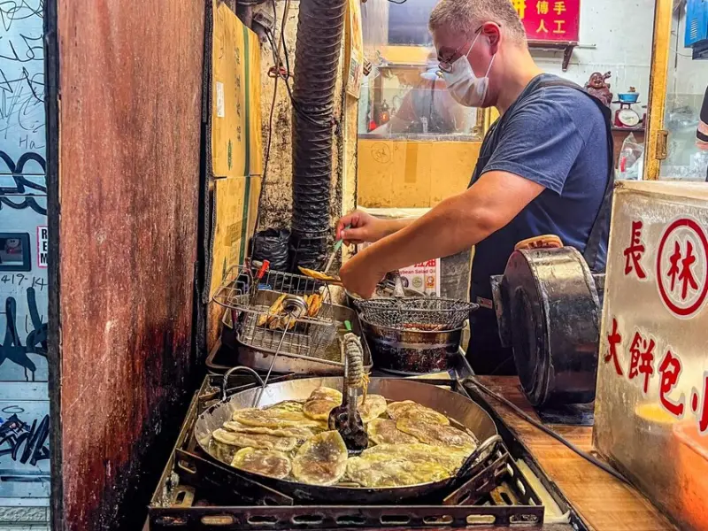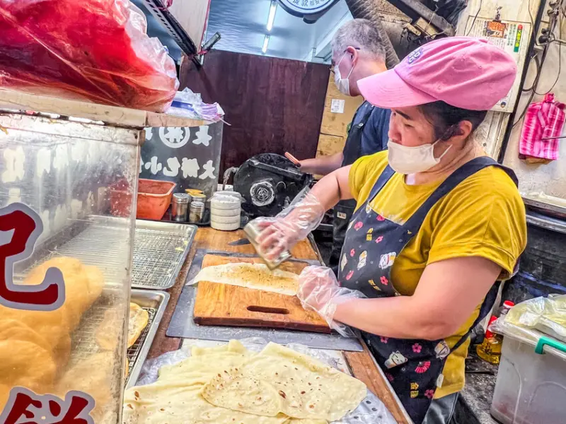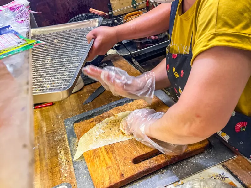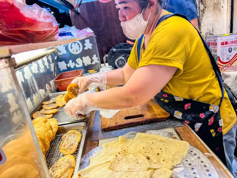 這個大餅包小餅的製作過程也很有趣。你點了之後,店家才會開始做。店員會先把那張大大的潤餅皮攤開,然後把炸好的小酥餅放在上面,喀啦喀啦地敲碎。接著會依照你點的口味,撒上不同的佐料,最後再把潤餅皮整個捲起來。這就是為什麼它叫做大餅包小餅啦,就是用大張的餅皮,把小塊的餅包在裡面嘛。