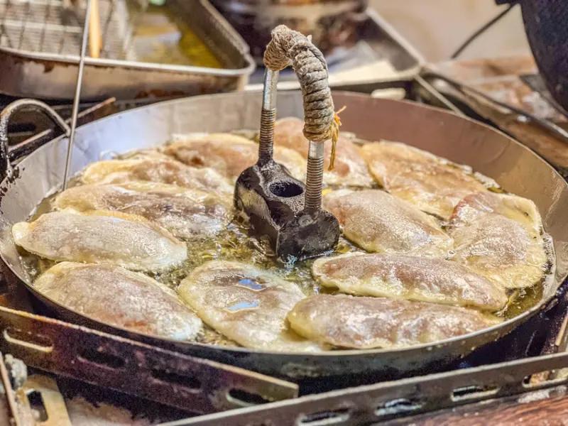 長林記大餅包小餅厲害的地方是,他們的潤餅皮跟酥餅都是自己手工製作的喔。你走過去看就可以看到,後面是他們在乾烙潤餅皮的地方,前面則是一個油鍋在炸那個小小的酥餅。我看那個油啊,感覺蠻乾淨的,油溫看起來也不會太高。炸好的酥餅會放在旁邊瀝油跟冷卻。