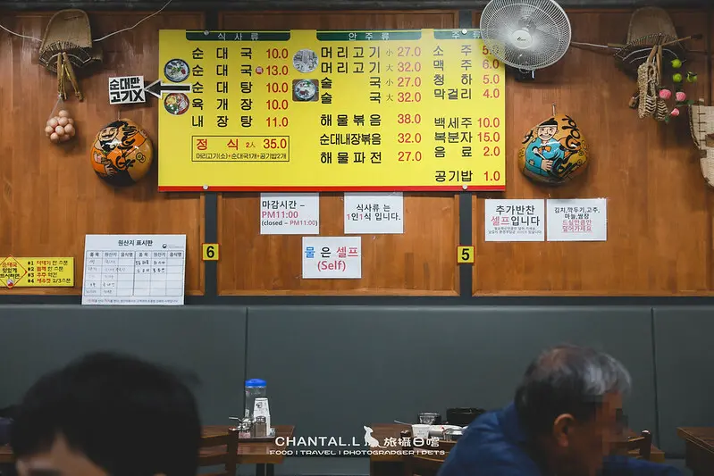 因為是朋友帶著我來的嘛,結果老闆娘,也就是朋友男友的媽媽啦,她人超好的,就直接給我們兩鍋基本款的血腸湯。老實說,我個人對內臟類的東西實在是有點不行啦,當下心裡有點小小的懊惱,怎麼沒有趕快開口跟她說我想吃牛肉湯就好,唉。不過也是到了這邊我才知道喔,原來在韓國吃這種湯飯類的東西啊,一個人點一份是基本的喔。血腸湯呢,它算是韓國很經典的庶民美食啦,尤其是那個血腸啊,你在市場啦、還是那種布馬帳,布帳馬車啦,都很常會看到這個東西。韓國的血腸跟我們台灣的大小腸比起來,不太一樣耶,它裡面除了豬血跟糯米之外啊,最特別的大概就是那個冬粉絲了吧,對,裡面會加冬粉絲喔。