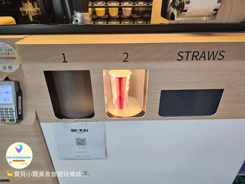 這次點了一杯抹茶豆漿加現煮珍珠。 付款完成之後。 就可以開始欣賞機器人親自製作手搖飲的表演了。 製作完成之後。 就可以拿到你的飲料囉。 別忘了拿吸管喔。 吸管在領取區右邊的格子裡可以拿得到。