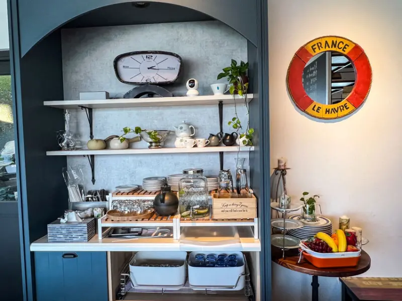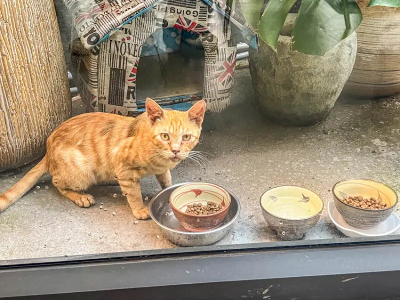 還有一個很溫馨的小細節,在後門附近啊,他們有放著貓食,專門給附近的流浪貓吃的。有時候呢,可愛的小貓咪還會跑來店裡串門子耶,會讓人感到格外溫馨。店裡旁邊還有一個超可愛、很有鄉村風格的自助區,那裡有水可以讓你自行取用喔。