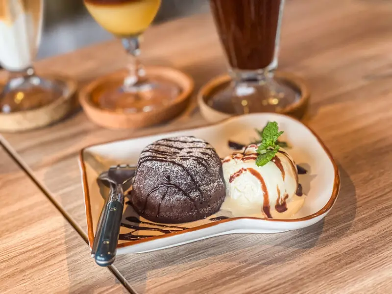 法式千層蛋糕是用香草千層蛋糕淋上香橙醬,吃起來不會太甜,熔岩巧克力佐冰淇淋算是水準以上的甜點,外層吃起來有點像布朗尼的口感,內裡是半榮的苦甜巧克力,然後熱熱的搭上旁邊的冰淇淋,很好吃!