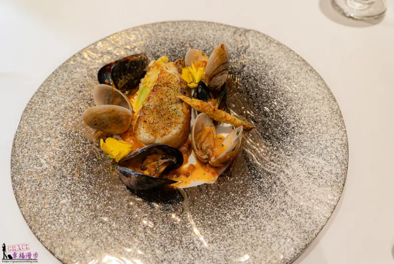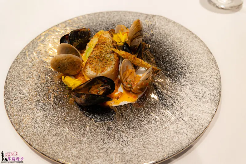 智利鱸魚的口感鮮嫩,香煎後的鱸魚更鮮甜,貝類肉質也很Q彈,多了甜椒醬汁的襯托更美味。