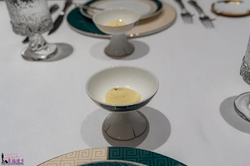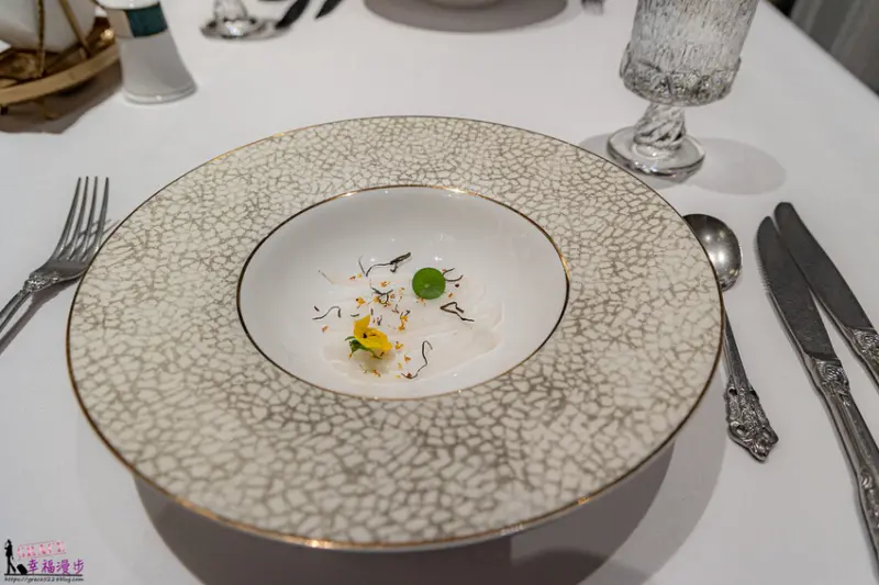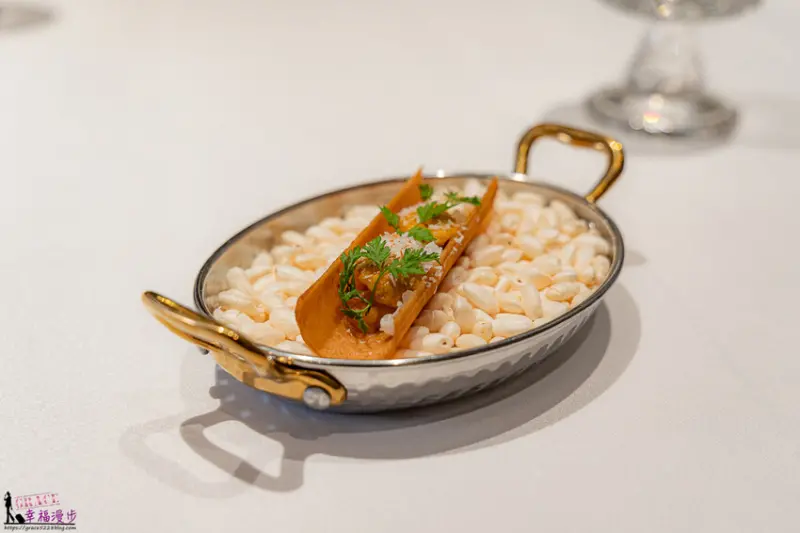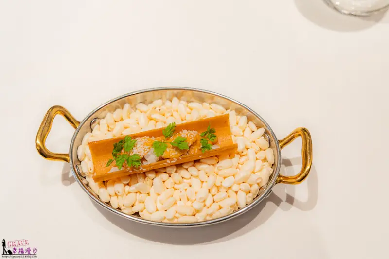 馬糞海膽・活帶子・花椒春捲,盤子上的米香是裝飾不可食用,是以馬糞海膽為主角,搭配上活帶子和花椒,再融合楊枝甘露,放在春捲皮上,創意十足的前菜開啟我們的味蕾。