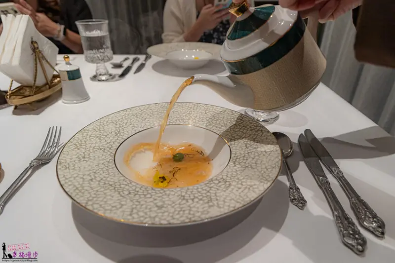 春捲皮就像餅乾般的酥脆,一口咬下會先品嘗到海膽鮮美的滋味,接著是楊枝甘露的果香隨後出現,層次感相當豐富的一道前菜。