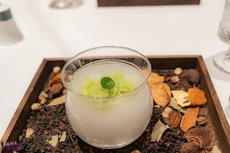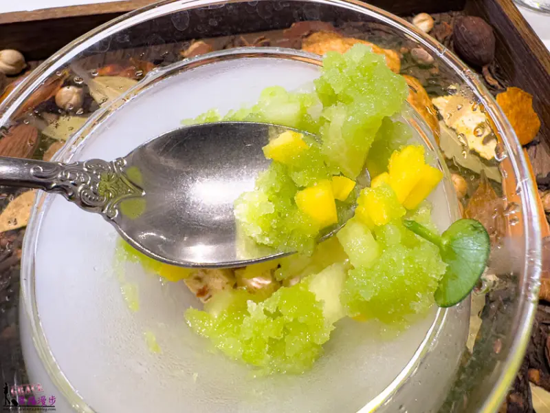 話梅奶凍、蜜瓜、苦瓜冰沙、白蘭樹下,這道甜品也太浮誇了吧!一上桌大家都拍個不停。