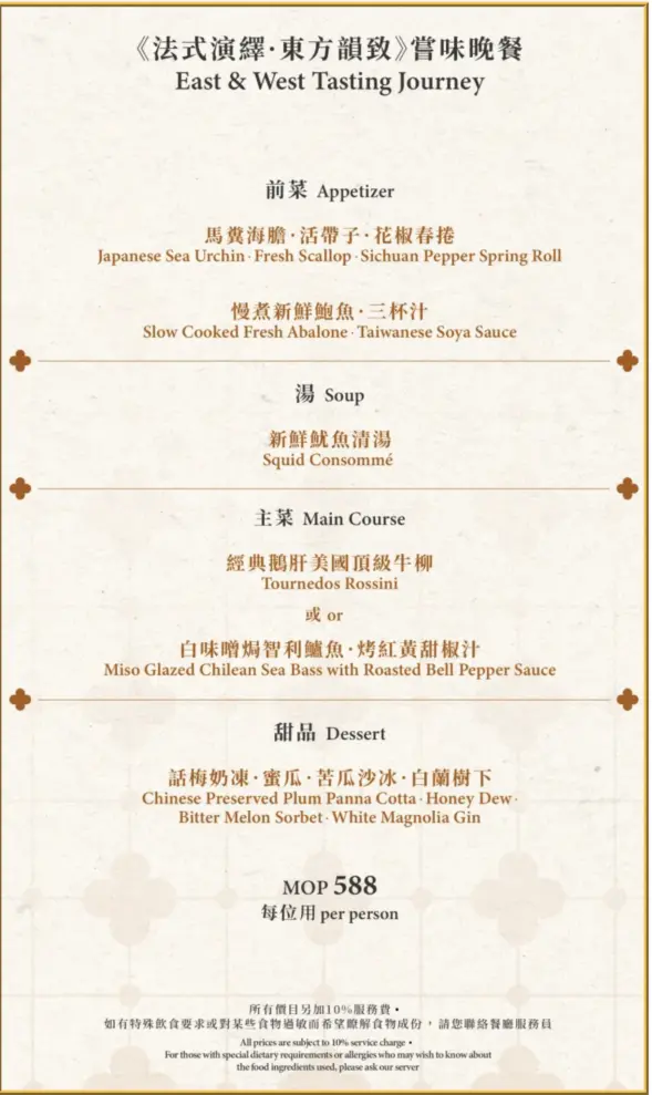 晚餐的MENU,想了解其他的餐點內容請點選更多菜單,我們這次享用的是「法式演繹。東方韻致」套餐,一個人價位是澳門幣588元,需加上一成服務費。