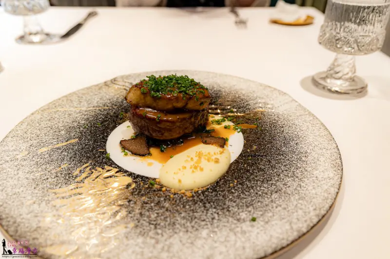 因為我跟小萱小編一起來用餐,我們就各點一份主餐,經典鵝肝 美國頂級牛柳,這是一道經典法式料理,有著鵝肝、牛柳、底下是波菜、薯泥和黑松露片,看起來就是很高級的一道餐點。