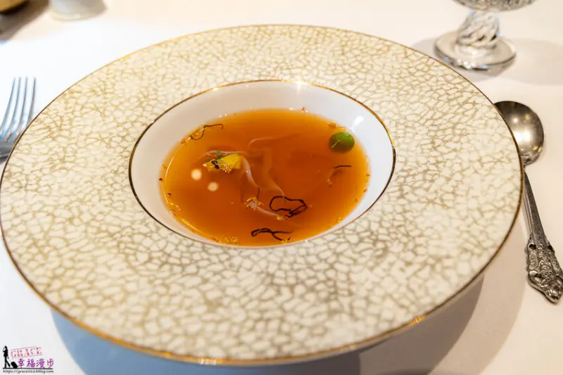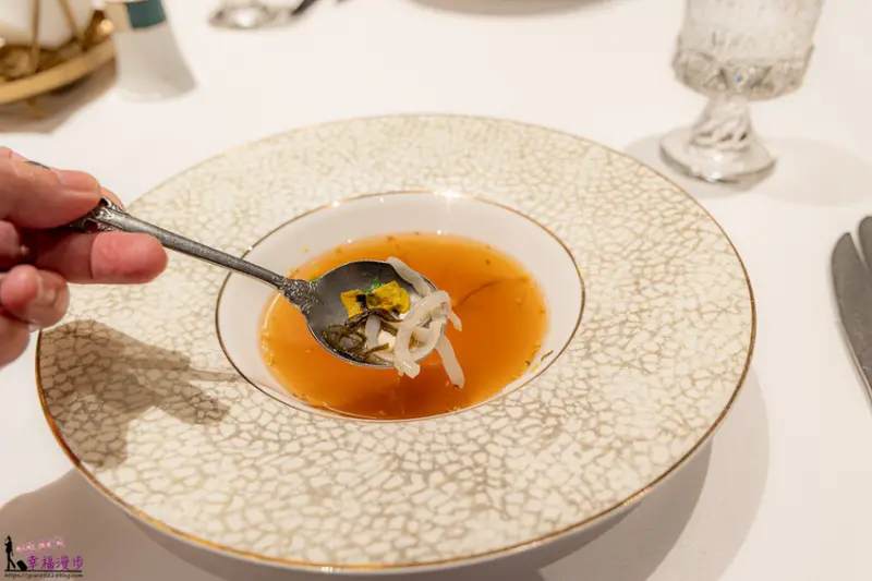 淋上高湯的魷魚瞬間就熟成了,金黃色澤的湯頭相當濃郁,入口後就能感受到深邃的鮮味,淡淡的鹹鮮喝起來會回甘耶!