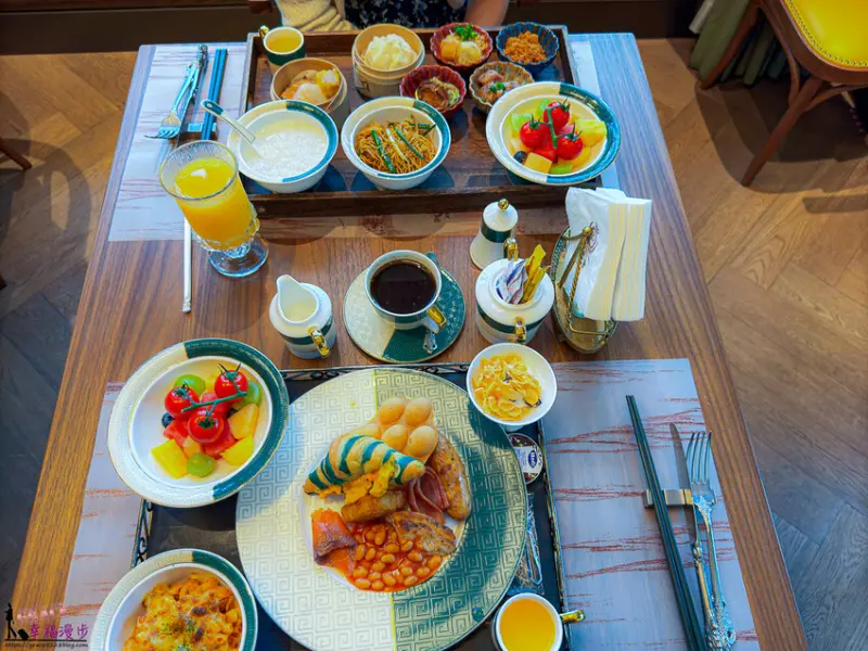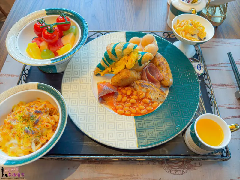 西式早餐有著精選水國盤、大餐盤上有著餐廳自製的可頌麵包、雞蛋仔、早餐腸、松露滑炒蛋、煙燻三文魚、薯餅、煙肉、慢煮雞胸肉和茄汁豆,乳酪上面有著果仁、提子乾、蜂蜜和玉米片,肉醬通心粉和果汁,可再搭上一杯飲品,營養滿分的西式早點。