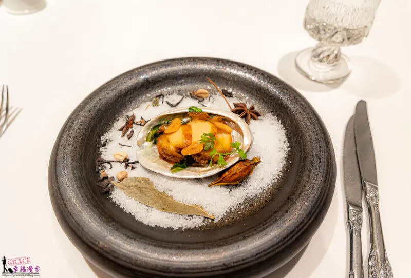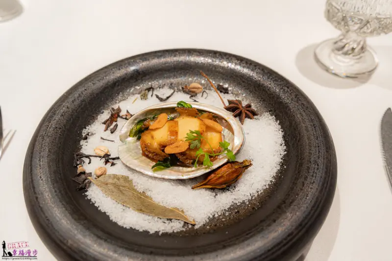慢煮新鮮鮑魚・三杯汁,新鮮鮑魚用三杯醬汁慢慢烹煮,搭配上萵筍、杏鮑菇底層還有烘烤過的羅勒,再撒上炸過的蒜片。