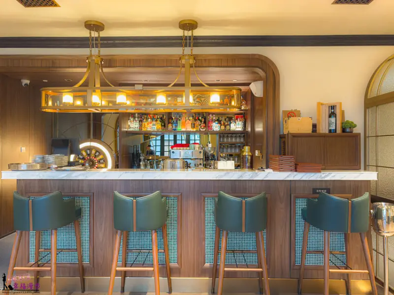 餐廳還有一個吧台區喔,坐在這裡喝一杯調酒感覺也挺不錯的。作者這次來用餐的人數比較多啦,所以餐廳幫他們安排了比較大的座位區喔,而且連這個座位區的餐具啊,都好精緻喔。