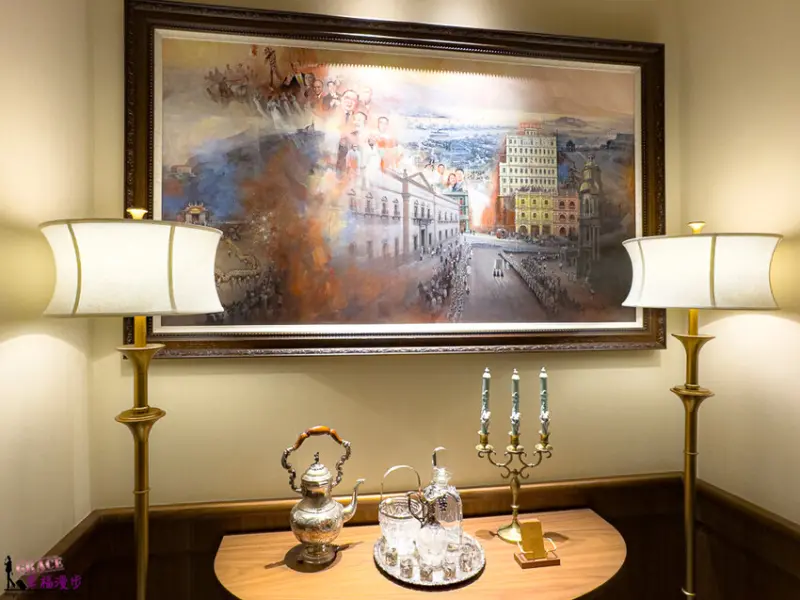 一進到餐廳裡面啊,你就會看到牆上有一幅畫喔,這幅畫啊代表著整個澳門歷史的意義喔。在一樓大廳也有一幅一模一樣的超大壁畫啦。