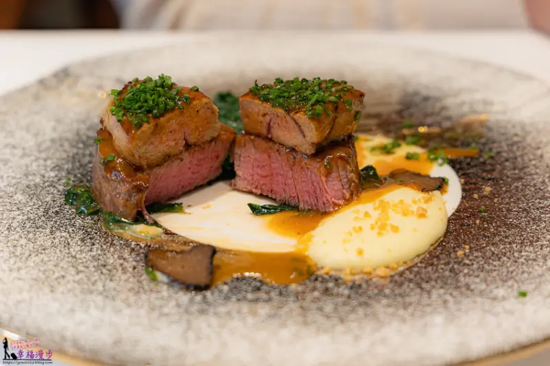 牛肉是點五分熟,還帶點粉嫩粉嫩的色澤,鵝肝相當細滑,入口後會慢慢的化開,牛柳的肉質略微偏硬,不會過於油膩,一旁馬鈴薯綿密又細緻真的很好吃。