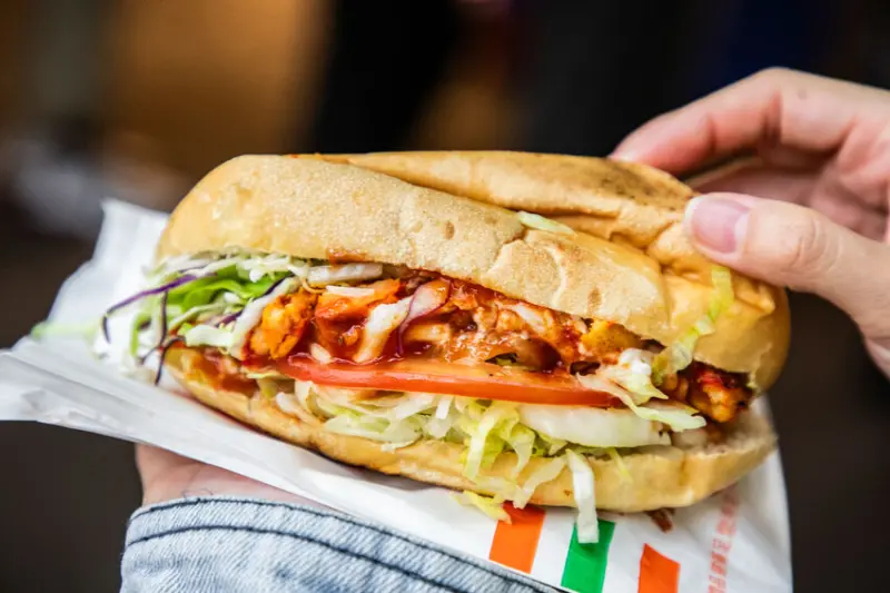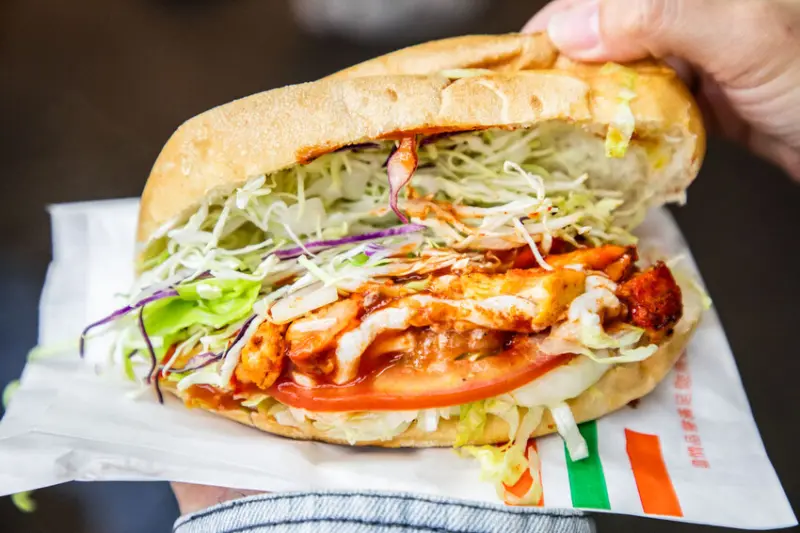 他們的配料啊、真的沒在跟你客氣的啦、不管你買大份還是小份、麵包裡面通通就是塞到爆出來。先放上生菜、再壓下去。接著上面會鋪上滿滿烤好的雞肉喔。光用看的就覺得超誘人的啦。