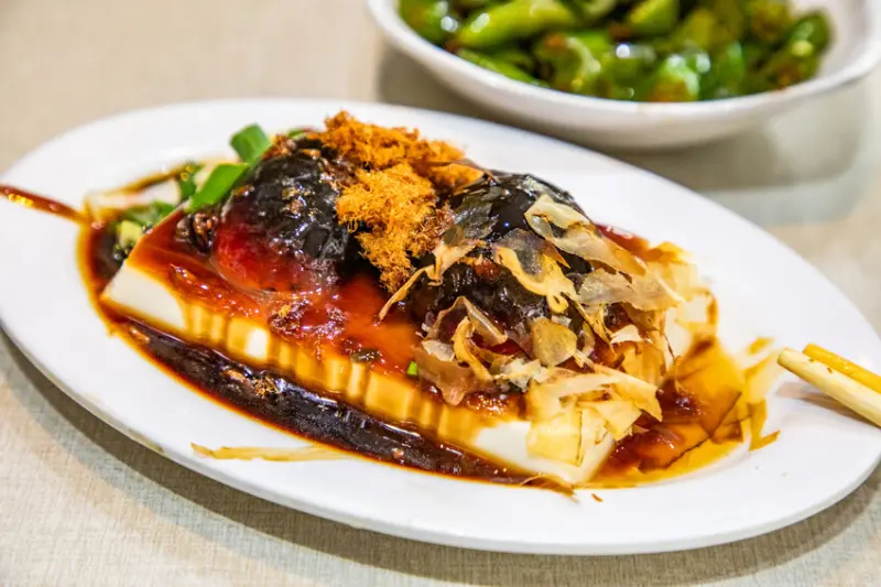 皮蛋豆腐,就是一般的皮蛋豆腐淋上醬油膏撒柴魚,但這還有多加肉鬆,更好吃!夏天這還蠻多人買的
