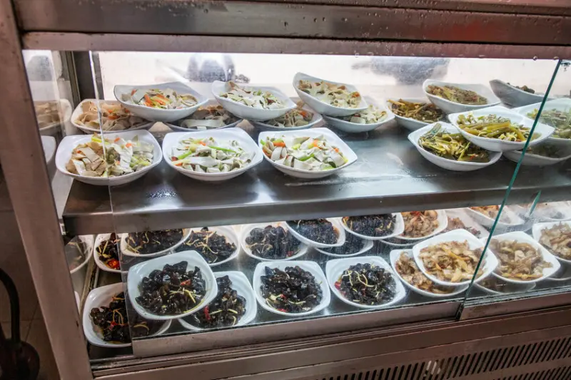 如果你是要內用、就不用跟外面外帶的人一起排隊喔、可以直接自己進去找位子坐、然後去櫃檯跟阿姨點餐就可以囉。不過我發現啊、來這邊內用的人相對不多、反而是外帶的客人超級多耶。內用區旁邊還有個小菜櫃、想吃什麼自己拿、吃完再一起結帳就OK了。小菜除了皮蛋豆腐是40元、其他的都是30元喔。廚房裡面簡直就是戰場啊、阿姨們一直煮麵煮不停。煮好的麵會送到前面去裝湯。光看外面排隊的人潮、還有那些煮好等著裝湯的排骨酥麵、就知道就算外面天氣熱到30幾度、大家還是超愛吃這碗熱騰騰的排骨麵啦、到底是有多好吃啊、讓人超好奇的。