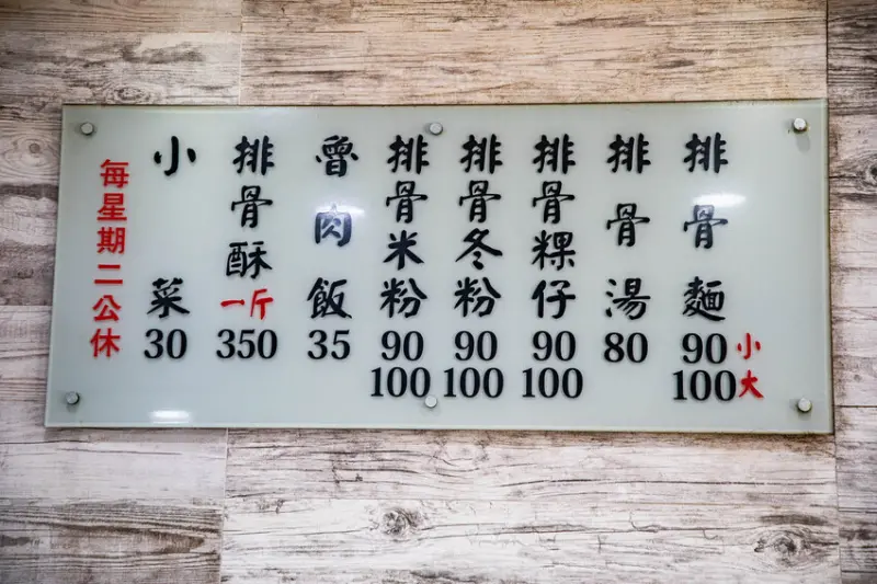 主要就是排骨麵,也有粿仔、冬粉、米粉等搭配,然後還有賣魯肉飯但沒看到有人點,排骨麵有大小碗之分,原本想點大的,後來發現點小碗的就可以了,阿姨手上那個白色大碗公就是小碗的!