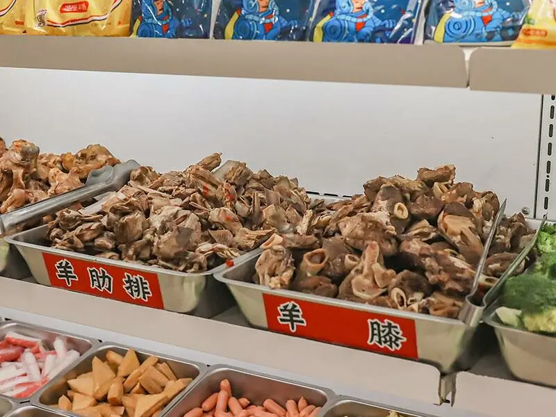 羊大骨、羊腳筋、羊肋排、羊膝等不同部位羊肉,火鍋料自助吧有傳統的芋頭、墨魚丸子、鴨血、鴨腸等琳琅滿目,蔬菜區滿滿的高麗菜和青江菜堆滿,還有附餐飲料、甜點、各式蛋糕和蛋塔。