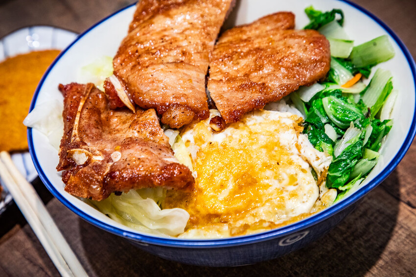 這次我第一次來,當然要點招牌來試試看啦。所以我點了香嫩排骨雙拼跟碳烤雞腿飯。如果你選擇內用,是用超大的瓷碗裝的喔,感覺整個質感都提升了,便當店也可以吃得很有儀式感捏。