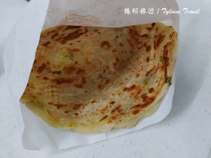 第三個是「三星蔥油餅」,外皮煎到焦黃酥脆,油使用的比例滿少的紙袋都不會有明顯的油膩感