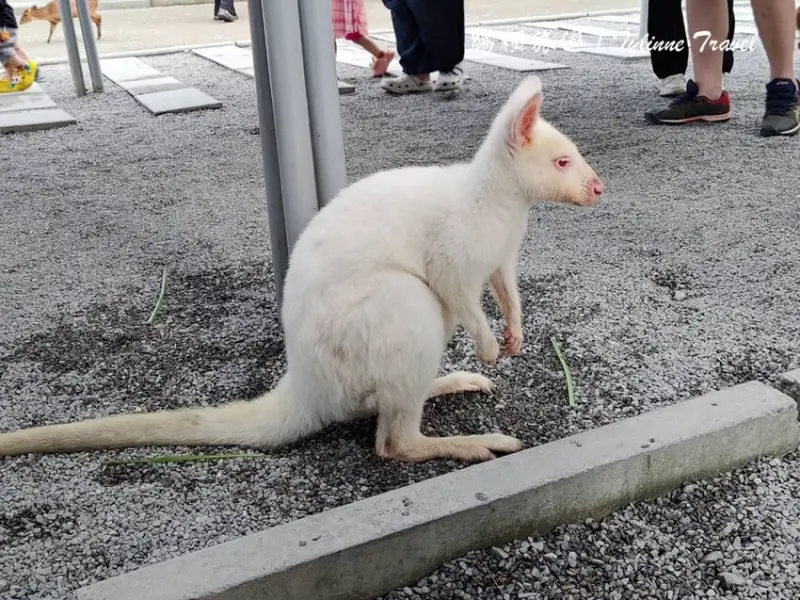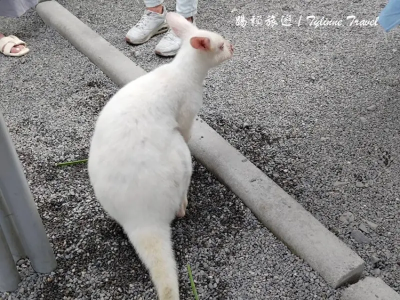 除了一般的「小袋鼠」外,還有非常罕見的「白色小袋鼠」,是一隻因為白化症缺少黑色素皮膚才會呈現白色的樣子,跟其他小袋鼠一樣都十分溫馴,手伸過去的時候還會過來聞幾下並且讓我們拍照