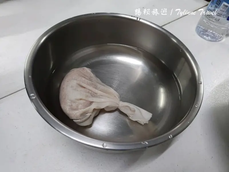 愛玉把愛玉籽裝在麻布袋中,放在水裡面慢慢搓揉就能看到水慢慢變色也變濃稠