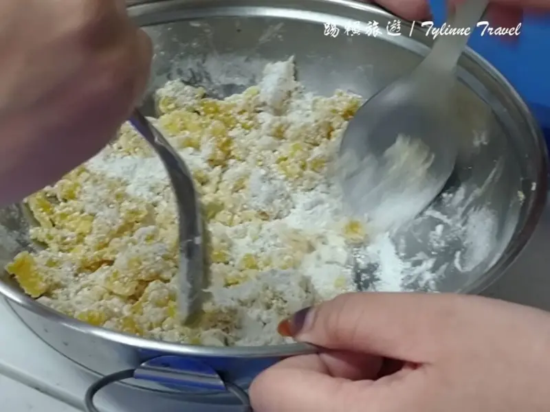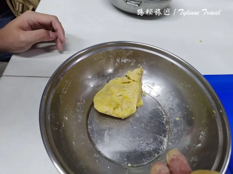 另一桌是「三色芋圓」,將不同食材和地瓜粉放入鍋中攪拌均勻