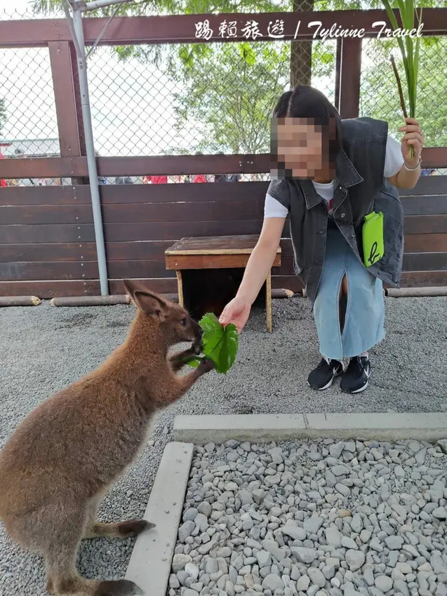 一開始工作人員跟我們提醒的時候還沒反應過來,下圖這位小朋友就馬上跑過來跑袋鼠手上的食物搶走,因為園區內的袋鼠脾氣都很溫和,食物被搶走後只會站在原地發呆等我們給牠新的葉子吃